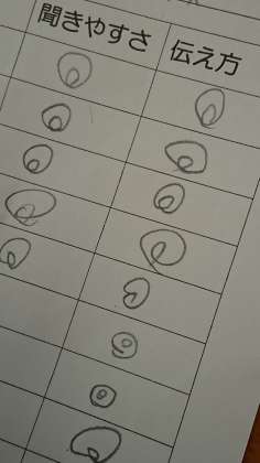 一人ずつ前で発表していました。聞く人は、よく聞いて伝え方の良さや聞きやすさなどを記録していきます。