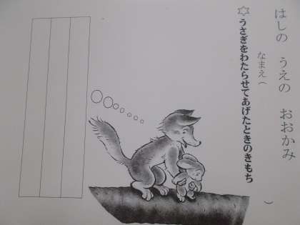 11/18 1年生『道徳公開』 1−3 公開日 2020/11/27 更新日 2020/11/27 できごと 「はしの うえの おおかみ」では、おおかみの気持ちを考えました。 最初は、意地悪をすることが楽しかったおおかみが、親切にした時の方がよい気持ちになったことから親切にすることの良さに気が付きました。 いいね(0)