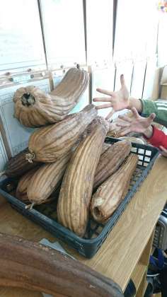 教室の後ろには、大きなヘチマがありました。パリッパリに乾燥して、今にも種が飛び出しそうです。子供たちの手の大きさと比べていただくと、大きさが分かるかと思います。