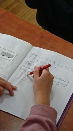 今日は、友達の考えを聞き、「いいな。」「分かりやすい。」などと思って取り入れたところを赤で書き足しているところでした。