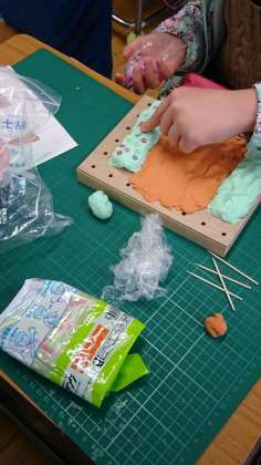 今日は、粘土ステージに粘土を付けたり、登場するキャラクターを作ったりしていました。物語をイメージしながら、熱心に制作にあたっていました。