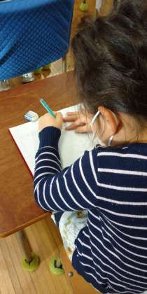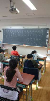 先生が黒板に20問の問題を書き、子供たちは一生懸命漢字を思い出しノートに書いていきます。問題を解き終わった人から、すぐに先生が丸をつけるため、間違えた漢字はこの時間に正しい漢字に直し、正しく覚えることができます。