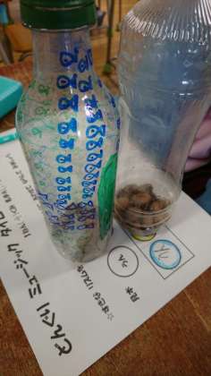 ペットボトルに思い思いの模様を描いてどんぐりを入れ、キャップを閉めればどんぐりマラカスの完成です。完成したら、「どんぐりミュージックタイム」です。自分で作ったすきなリズムに合わせて陽気にマラカスの音を響かせます。