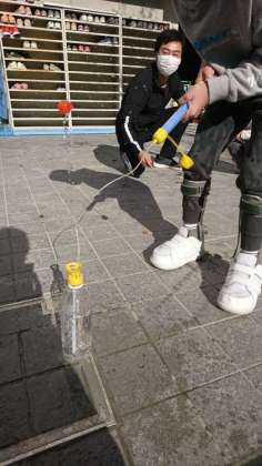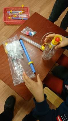 実験は、空気を押し出す力を使って、水を噴水のように噴射させるものでした。これが意外に難しい。なかなか水が噴き出しません。調整しながら、何度かやっているうちに見事成功する子が出てきました。球が高く上がります。