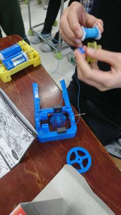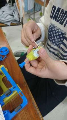 先日紹介したのとは別の学級で、作ったコイルを使ってお手製モーターを作っていました。