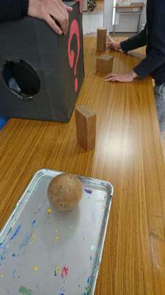 「?ボックス」に入ったお菓子などの箱の形が、どの形か当てます。手を入れて触ってみると、どうやら筒のような形をしているようです。これは・・・