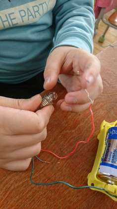 豆電球と電池ボックスのついた実験用のキットがそれぞれに渡されています。今日は、電気を通すものを調べる実験を行っていくようです。