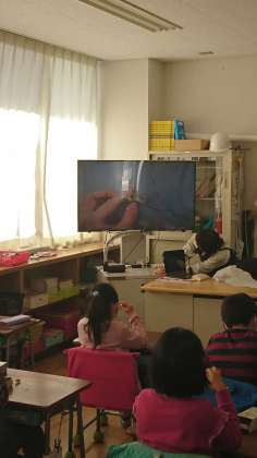 これをここに通して、ここにつないで・・・テレビ画面に手元を映したものを見たり、説明書を見たりしながら進めますが、なかなか皆が同じように準備が進みません。実験にたどり着くまでの準備が一番大変です。