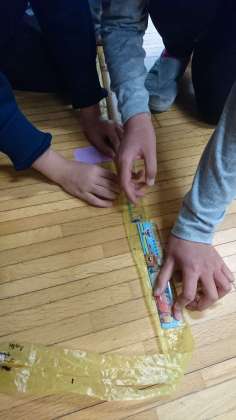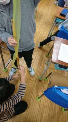 昨日お伝えした「前」の時間の内容です。1mのものさしよりも長い長さをテープで写し取って、工夫して測ります。1mものさしの先に、自分たちの定規を合体させて、1mの先の長さを測っています。それでも足りず、定規を動かしながら、長さを測っていました。