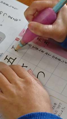 読み方、書き順などを確認して、個々に練習に入ります。握る力が弱い子には、えんぴつを握るための補助具を使っています。これは、その子に合わせてオリジナルで作られているものです。お湯につけて暖めると、形を変えられるそうです。