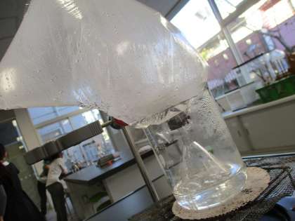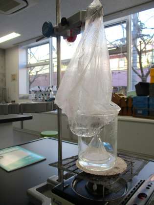 今日は、沸騰して出てきたあわをビニールぶくろに集めました。中に水滴がつけば、それは水蒸気だといえます。また、もし空気なら水滴はつかないし、冷えてもビニールはふくらんだままのはず。