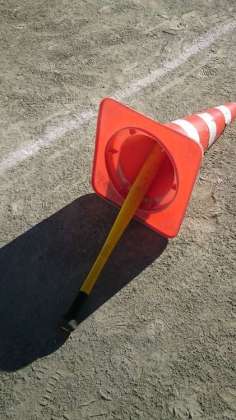 さて、一番右の写真は、今日見てとても感心したものです。倒れたコーンにバットが入っています。いたずらではありません。打ったバッターが、1塁に向かって走りますが、走り出してからまずバットをコーンに入れていました。打った後にバットを投げて周りの子に当たあることを防止するための策でしょう。子供たちの意識も「バットはコーンに入れる。」という方に向くので、安全に取り組めます。ナイスアイデア!