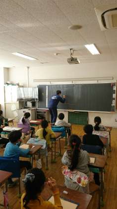自分の夢や未来への希望を言葉にしてカードに書きます。写真にもしっかり写るように、大きく書くよう担任が例示をしてみせますが、文字を大きく書くのはなかなか難しいものです。夢はでっかく、文字もでっかく!宇宙へ届け、子供たちの夢!