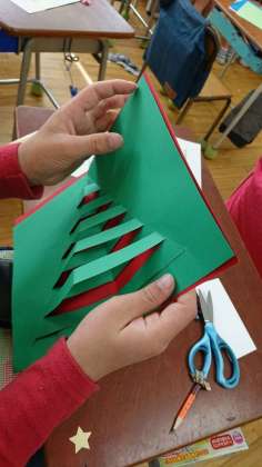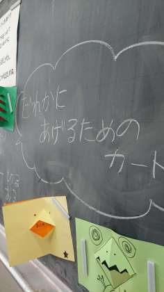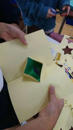 今回は、「とびだすカード」で、「だれかにあげるためのカード」だそうです。飛び出す仕掛けの仕組みをいくつか教わって、選んで作っていました。今の季節にぴったりのカードもあります。