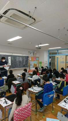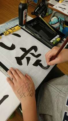 左の写真「い空」を書く子、美しい字です。その字に目が行きますが、よく見ると、手に「書写」と書かれています。きっと今日の書き初め練習に習字道具を忘れないように手に書いたのでしょうね。ないすです。
