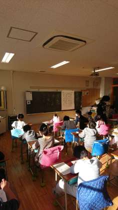 右の写真は、同じ時間の他クラスですが、南校舎の午前中は、晴れていればご覧の通りの日当たりでポカポカです。エアコン・日差し・カーテン・風・換気・・・バランスを取りながら過ごしていきます。