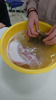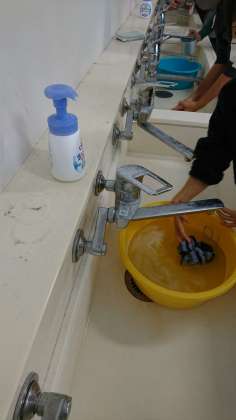 たらいを使って、靴下や体育着の紅白帽子を洗濯しています。