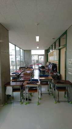 5年生の教室の前に机が並んでいます。私の侵入(!?)を防ぐバリケードか、と思ったら、床を使って書き初めの練習をするためにどかしたもので、温かく迎えていただきました。失礼しました。