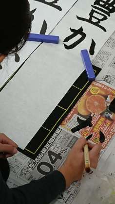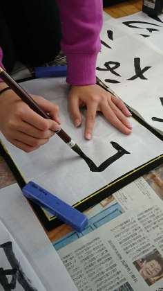 ということで、中へ入れていただきます。5年生の書き初めは、「豊かな心」です。「豊」の画数が多くて難しそうですね。平仮名の「か」と「な」もバランスが難しい!心も太さの強弱を付けて、思い切って書く必要があります。高学年の課題はだんだん難しくなっていきます。