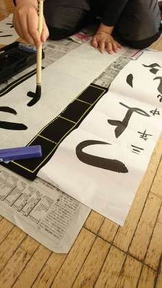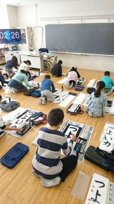 3年生は、2学期末に学校で練習し、冬休み中にご家庭でも練習に取り組んでいただいた「つよい力」の4文字を、長い本番用の用紙に書いていきます。枚数は限られているので、1枚ずつに集中して取り組みます。