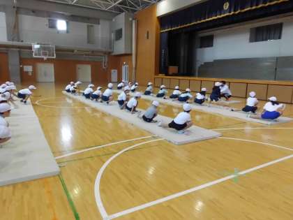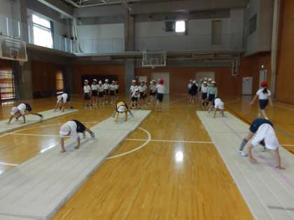 音楽に合わせた楽しいウォームアップから始まり、3・4・5段の開脚跳びまでチャレンジしました。どの児童も魔法がかかったかのように、笑顔でとび箱を跳ぶことができました。