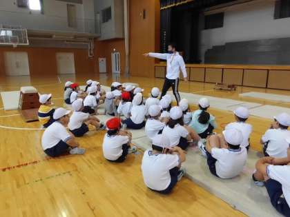 オリンピック・パラリンピック教育の一環で、全学年外部講師による体育の特別授業を行っています。2年生は、パオパオスポーツクラブの伊東雄大さんに「とびばこあそび」の指導をしていただきました。