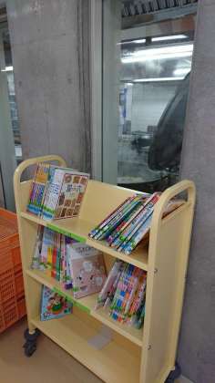 ブックトラックの奥では、調理室の大きな釜から湯気が上がっています。今日の給食はなんでしょう。お腹がすいてきました。