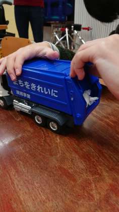 ごみ収集車、クレーン車、トラック、バス・・・触って、動かして、車のはたらきを言葉で表現していました。