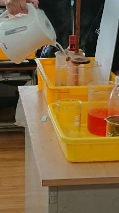「ものの体積と温度」を学習をしています。今日は、水の体積について実験を行っていました。