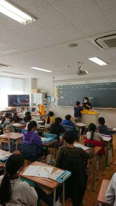 教室での代表実験で行っています。全体でも結果が見やすいように、水の位置に付箋を貼ったり、画面に大きく映したりしていました。その甲斐あって、熱湯で温められた水は、体積を増やし、目に見えて水面が上がりました。見ていた子が思わず声を出しました。