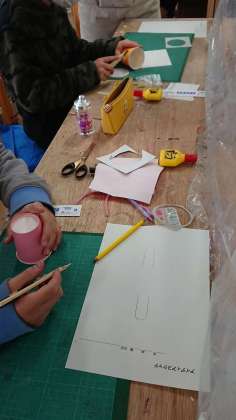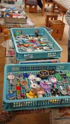 5年生もそうでしたが、6年生も材料がいろいろあって面白いです。ベースになる部分からある程度自由に選べるのは、楽しくもあり、難しくもあると思います。そこは高学年だからこそできるところでしょう。右の写真は、5年生の完成品を集めたかごです。材料が色々な分、作品もバラエティに富んで面白いです。