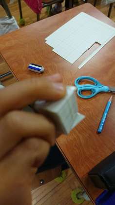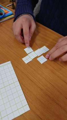 箱の形は、何種類かに分かれますが、今日は「サイコロの形」の箱の学習をしていました。箱を開いた図を作っています。正方形の面が6枚から作られていることが分かっているので、それを組み合わせたときに、箱の形になる図にします。6枚の正方形の方眼紙を使って考えていました。