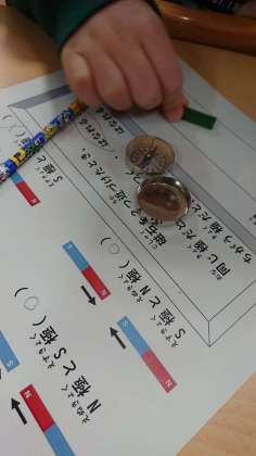 極と極が引き付け合ったり、退け合ったりする性質を実験で確かめました。その後、極の「S」と「N」が何を指すのかについて、方位磁針を使って考えていました。ちょっと難しい話です。ですが、方位磁針が配られると、磁石を近づけたり、いろいろな方向をむい向いて針の動きを確かめたりして興味津々で取り組んでいました。