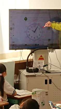 今回は「なんじなんぷん」で、時計の長い針が指す時刻「分」を学習します。目盛りの読み方を皆で確認して、練習をしています。