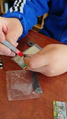丸型磁石の極を決めるためにどうすればよいか考えています。意見が出て、実験方法が決まり、確かめていました。ここまでの学習をしっかり生かして考えられています。個々にキットがあるので、実験に入るのもスムーズです。