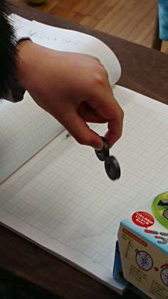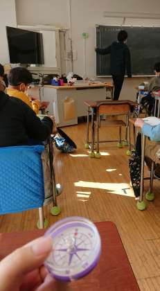 方位磁針も少し触ってみました。針の赤い部分が黒板の方を指しています。ということは、こっちが「北」?