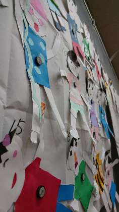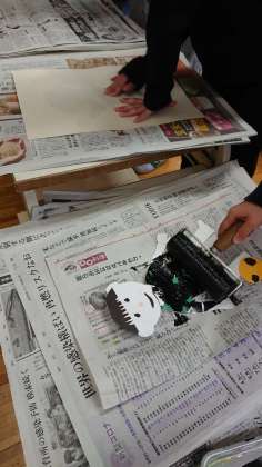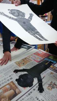 できあがった人物にインクをつけて、版画にしていました。カラーで作ってあって、これだけでも作品になりそうです。しかし、版画にするのはもったいないかも、などと思った私が浅はかでした。版画にすると細部まで浮き上がるように刷れていて、版画にすることでより魅力が増したように感じました。