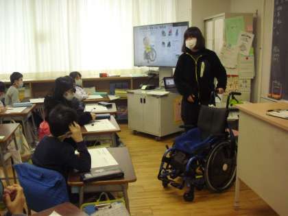 くすのき学級、きはだ学級の先生方をゲストティーチャーに招いて、児童の様子や特別な配慮、車椅子の押し方などについて話を聞きました。子供たちは、ワークシートにメモをとりながら聞き、