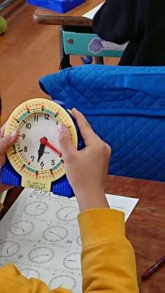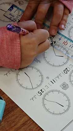 今日は、指定された時刻の時計の針を描いていました。短針「何時」は難しいので、長針「何分」のみです。問題がたくさんあります。