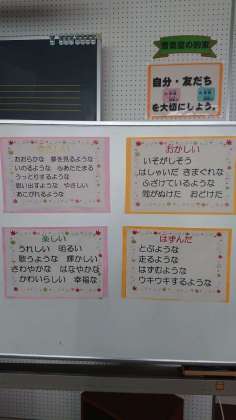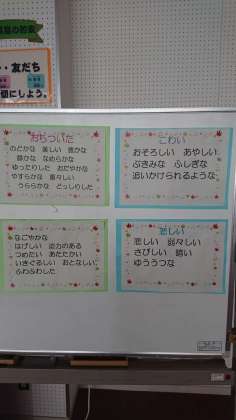 前のホワイトボードには、言葉で表現する例が出されています。これを参考にすれば、より豊かに感じたことを表現できますね。初めは借り物の表現でも、使っていくうちに自分の中に溶け込んで自分の表現になっていくでしょう。できるだけいろいろな表現に触れ、使っていくことが大切だと思います。