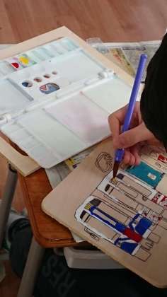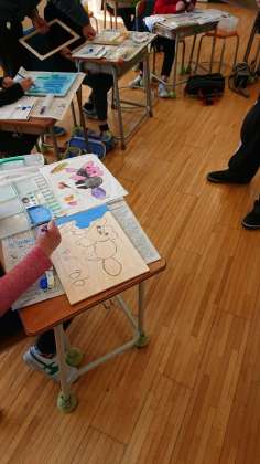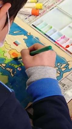 時間をかけて、色塗りの続きをしています。特に高学年の作品は、絵も細かく、丁寧に、丁寧に塗っていました。次は、切るところをお伝えできるかもしれません。
