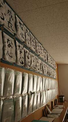 書写は、右の写真のように、教室の後ろに掲示されています(写真は、5年生の教室のもの)。今度、後ろの壁いっぱいの「ゆめ」を見に行きたいと思います。