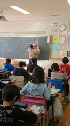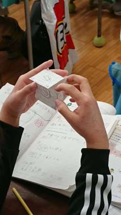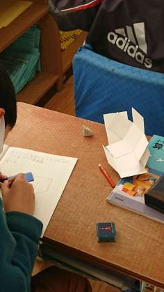 方眼紙で展開図(箱を開いた形・図)を作り、辺や面の関係について考えていました。実際に動かして確かめられるので、開いたり、閉じたりしながら関係を見つけていました。段々とそれを頭の中で行っていきます。頭の中で動かすイメージをもつためには、ここでたくさん触って動かしてという経験をすることが大切です。これは得手不得手が分かれることろですが、苦手であれば尚更たくさん実物を触る経験をしてほしいと思います。