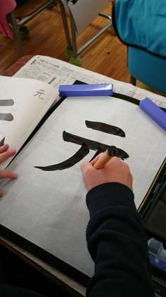 の一字を、半紙いっぱいに力強く書いていました。元気の「元」をイメージしながら書いているのでしょうか。それとも先生の名前かな?