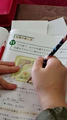 と、初め戸惑った子供たちでしたが、例を示され、「そういうことか!」と分かったようです。今回は、地図上の位置なので、「方角と距離」で表します。