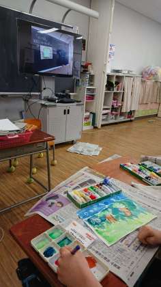 きはだ学級の図工です。今日は、「はじき絵」を制作中でした。