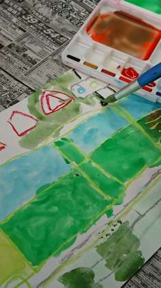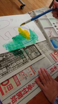 絵の具は小指くらい、水加減はしょうゆくらい、と指示が出ました。分かりやすい。少し薄いくらいの色で塗ると、クレパスの線が際立ってよりきれいに仕上がります。