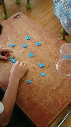 おはじきを同じ数ずつ分ける作業を式に表していました。何個あるか数えます。