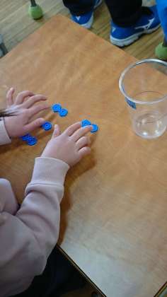 と数える児童もいます。このおはじきを同じ数ずつ分けていきます。2個ずつ分けたり、3個ずつ分けたりしています。中には、5個ずつ分ける児童もいましたが、最後は5個になりませんでした。それも大切な気付きです。