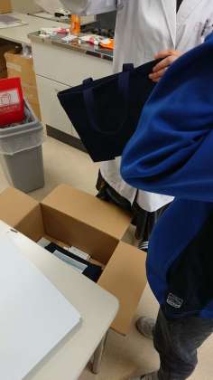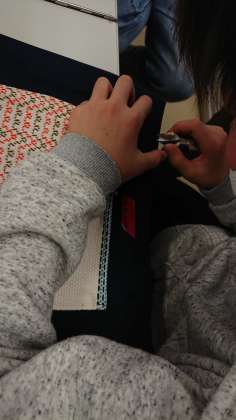 6年生は、ミシンを使って制作したトートバッグに、丁寧に縫ったスウェーデン刺繍を組み合わせた作品を展示します。仕上げの作業や名札付けをして、展覧会で飾れるようにしています。